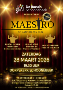 Op 28 maart 2026 organiseert De Bazuin de 4e editie van het Maestro Concert in de Dorpskerk in Schoonebeek. Een avond vol muziek, plezier en een gezonde dosis spanning!